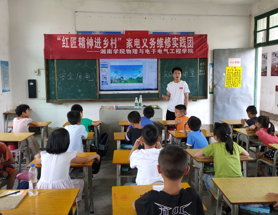 中国青年网郴州7月26日电(通讯员 申小敏 肖东 刘鑫瑜)为践行红匠精神,锤炼红色意志,助力乡村振兴。7月12日-7月17日,bb贝博艾弗森官网“红匠精神进乡村”家电义务维修实践团在“半条被子”发源地——郴州市汝城县文明瑶族乡开展为期7天的社会实践活动。期间,队员免费为村民开展家电义务维修、用电安全知识宣传,为儿童开展用电生命安全教育、用电科普知识教育等活动。