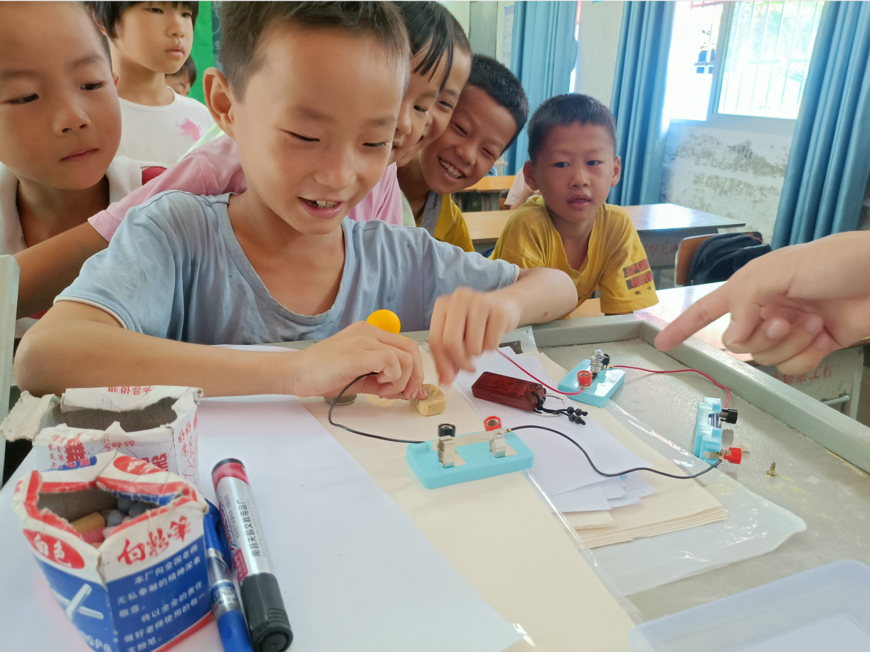 图为团队把用电科普知识带进课堂,乡村儿童对新奇的电路实验充满好奇。中国青年网通讯员 刘鑫瑜 摄