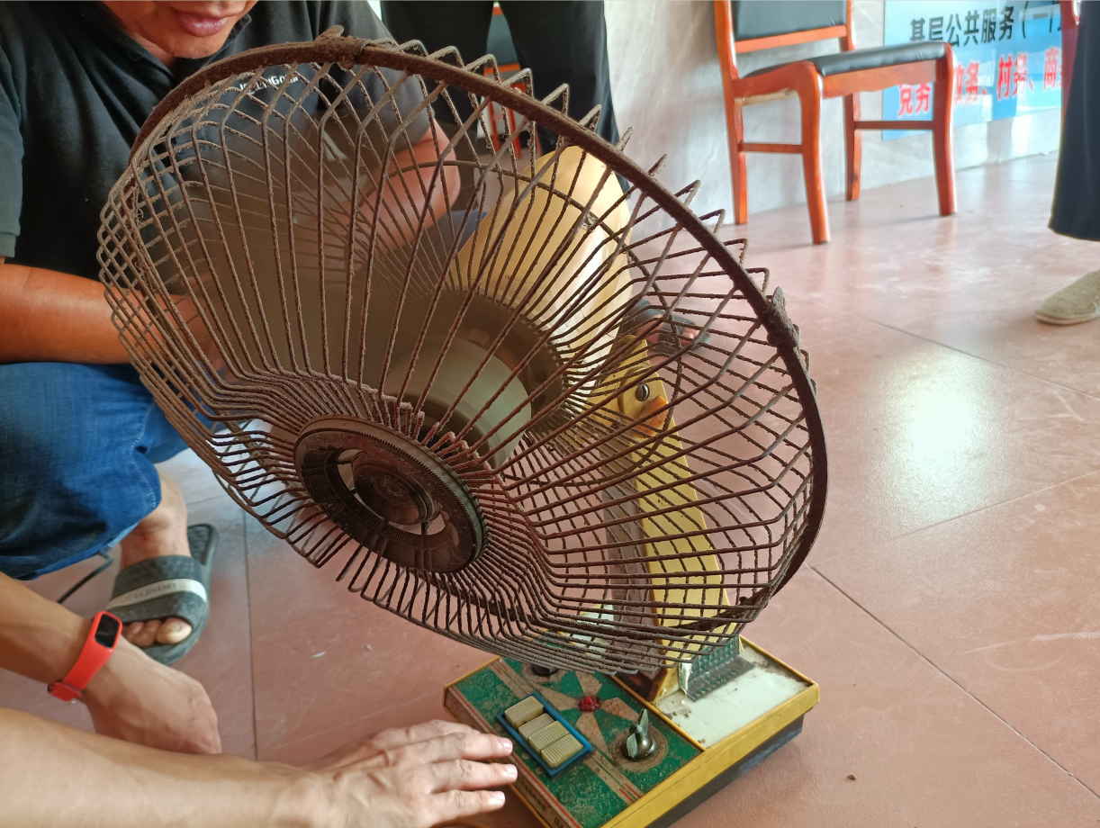 图为陪伴了村民爷爷20余年的老风扇,转动的风轮唤醒了珍贵的回忆,也见证了团队的成果。中国青年网通讯员 肖东 摄
