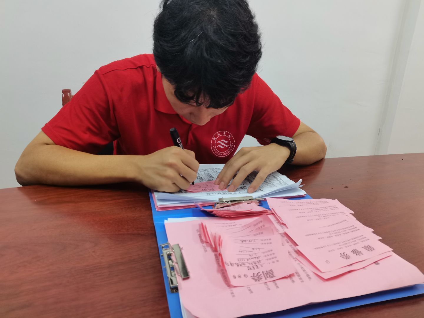 图为队员整理维修券,一叠又一叠的维修券是“我为群众办实事”最好的诠释。中国青年网通讯员 刘鑫瑜 摄