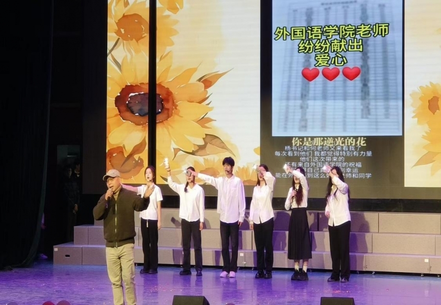 本网讯(通讯员 王鹏亮 赵柳青)“你是那逆光的花,泪光中把根扎,你用微笑把苦难融化……”在日前举行的学校第二十三届外语文化艺术节闭幕式晚会上,有这样一个特别的节目,外国语学院党委书记李气纠亲自作词并登台献唱歌曲《逆光的花》,为学院烧伤学子曹佳奕加油鼓劲,台下师生手中摇摆着手机闪光灯,现场一片温馨与感动……