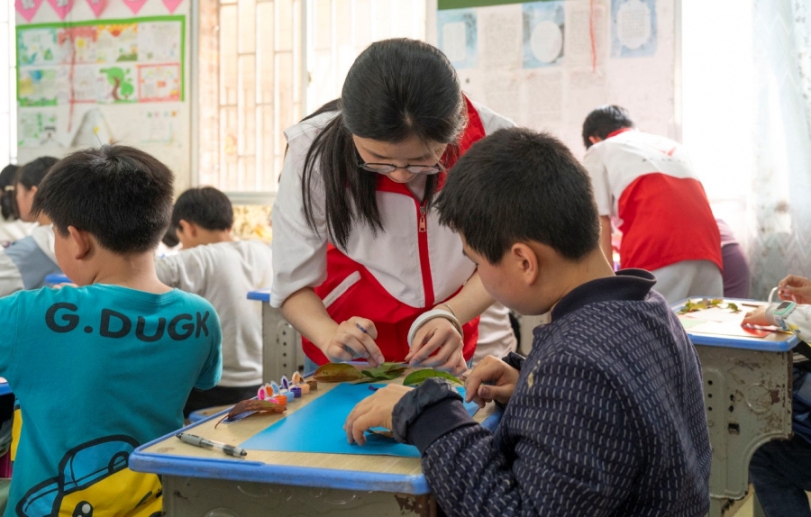 志愿者指导学生完成“树叶创意画”