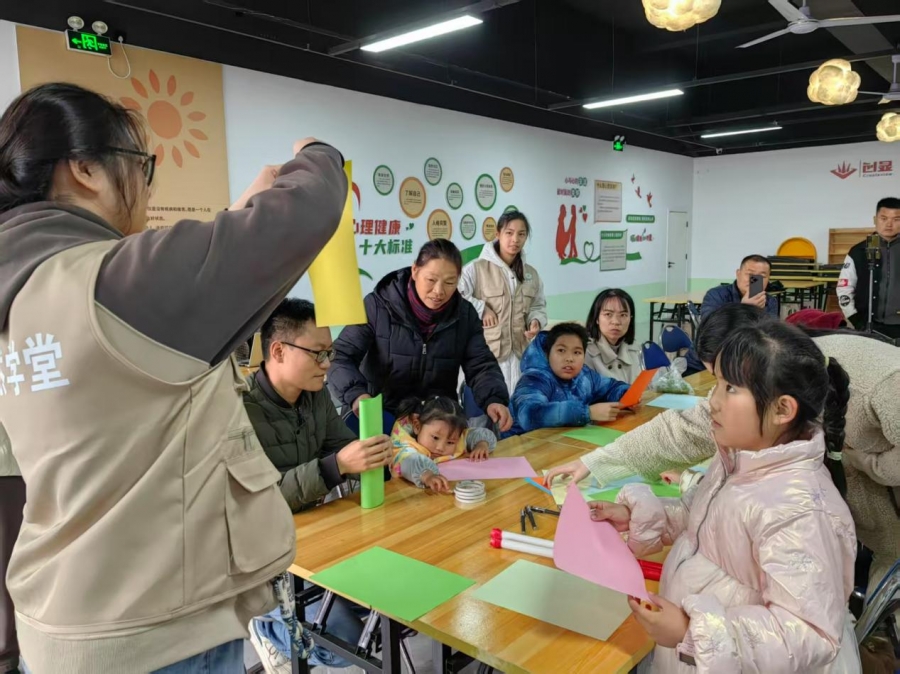 活动伊始,志愿者以“同心鼓”破冰游戏拉近亲子距离。家长与孩子手握鼓绳、协同发力。“第一次和孩子一起玩团队游戏,看到他专注调整力度的样子,感觉特别暖心。”家长邹女士感慨道。活动志愿者田桂玲表示,游戏不仅活跃了气氛,更让家长与孩子在协作中建立默契,为后续环节奠定基础。
