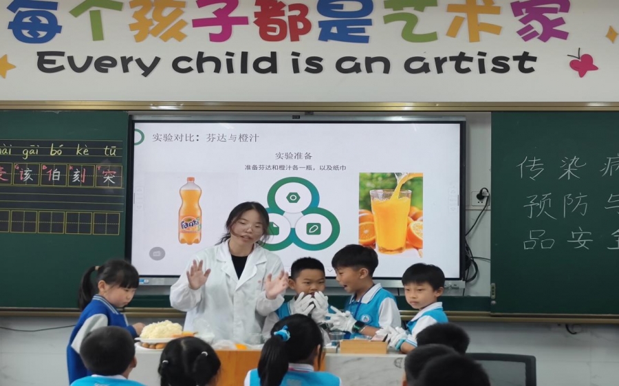 团队成员还带来情景剧《饮料的“秘密”》和色素对比实验,直观展示碳酸饮料中添加剂和色素的危害,引导孩子们养成“少喝饮料、多吃水果”的健康习惯。活动最后,团队为优秀的孩子们发放了笔袋、盲盒笔等礼品,并带领全体学生诵读健康口诀:“传病预防记心间,洗手七步保安全。食品健康会分辨,营养均衡体强健”,活动在朗朗口诀中圆满结束。