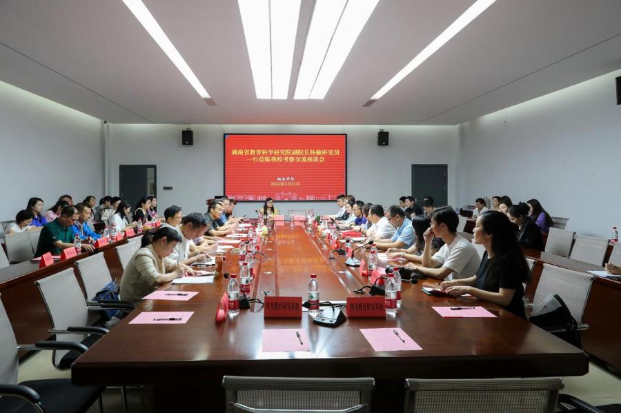 本网讯(通讯员 付雨洁 摄影 佘伟灏)5月31日,湖南省教育科学研究院副院长杨敏一行来校考察,校党委书记邹宏如出席座谈会,党委副书记刘卫平主持会议。
