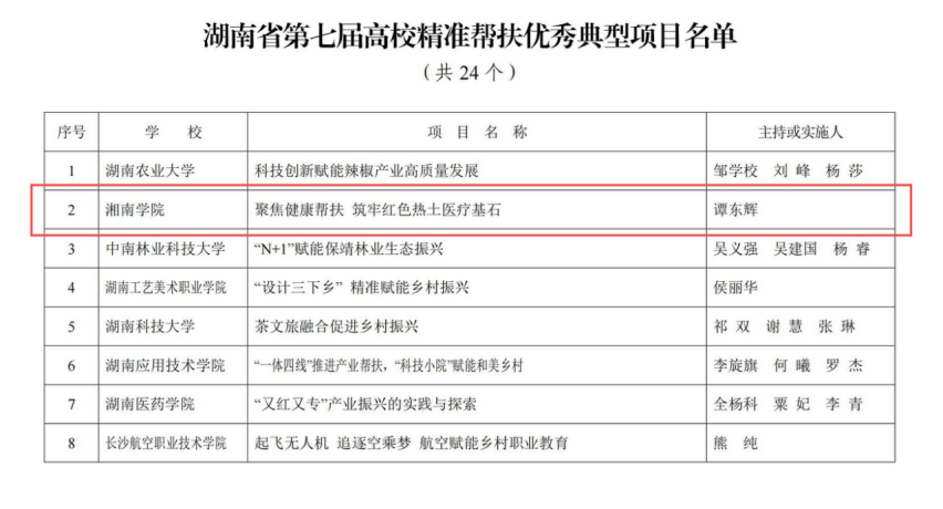 本网讯(通讯员 郭卫玮)近日,湖南省教育厅公布了第七届全省高校精准帮扶优秀典型项目评选结果,贝博《聚焦健康帮扶 筑牢红色热土医疗基石》项目成功入选。这是贝博近三年来第二次入选该项目,也是贝博坚持与区域发展同频共振,积极融入乡村振兴工作大局中取得的又一项荣誉。