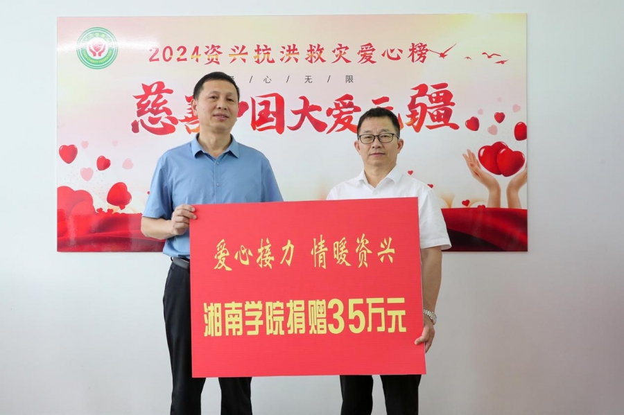 8月10日上午,校党委委员、副校长高守平带队前往资兴市慈善总会,将35万善款捐赠给资兴市慈善总会,助力灾区恢复重建。资兴市人大常委会原党组成员、副主任李向东,资兴市慈善总会会长郑艾萍出席捐赠仪式。