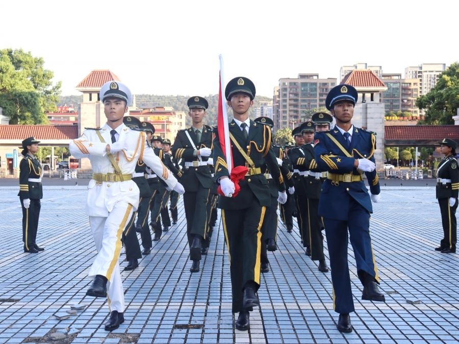 早上7点,国旗护卫队踏着铿锵有力的步伐护送国旗至升旗台。伴随着庄严的《义勇军进行曲》,五星红旗冉冉升起,迎风飘扬,全体师生行注目礼。