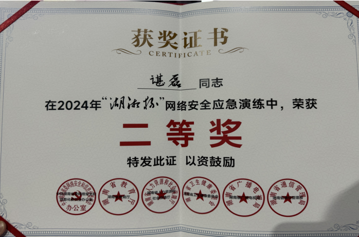 本网讯(通讯员 于芳) 9月10日上午,湖南省2024年国家网络安全宣传周启动仪式现场举行了2024年“湖湘杯”网络安全应急演练颁奖仪式,贝博计算机与人工智能学院学生谌磊在2024年“湖湘杯”网络安全应急演练比赛中凭借出色的表现荣获二等奖。