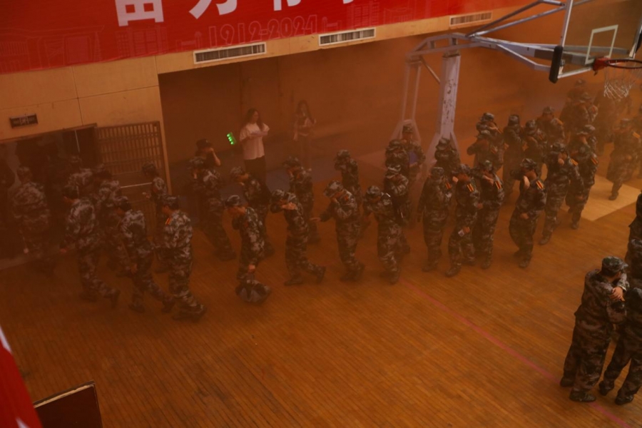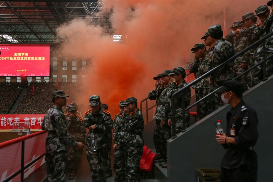 讲座结束后,还开展了消防安全演练。随着演示烟雾弥漫和报警器拉响,2024级全体新生弯腰捂住口鼻,在军训教官的带领下,有条不紊离开体育馆并抵达安全区域,成功完成应急疏散逃生演练。