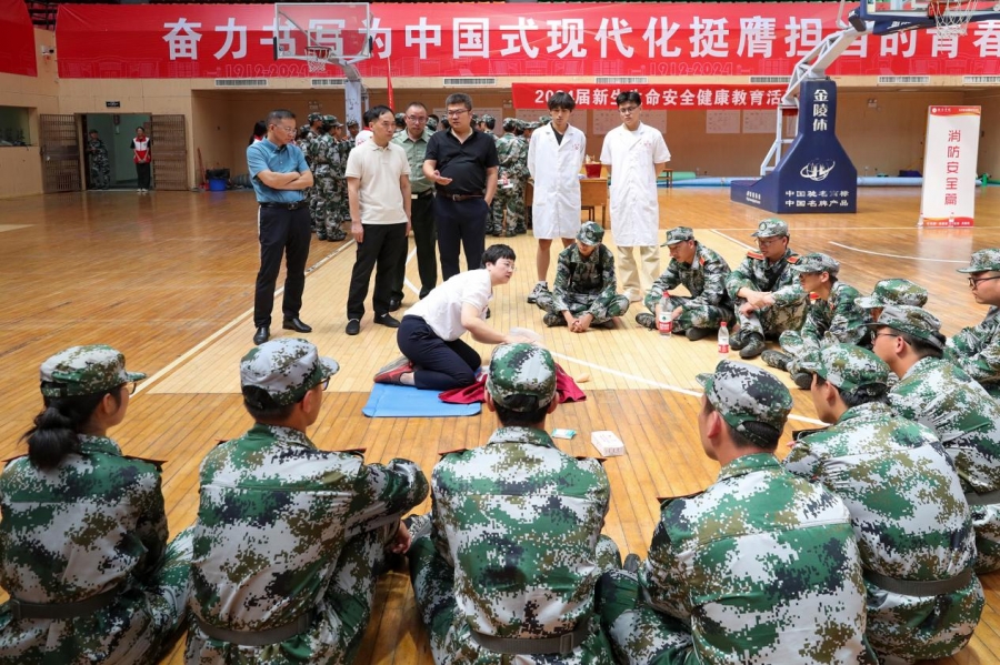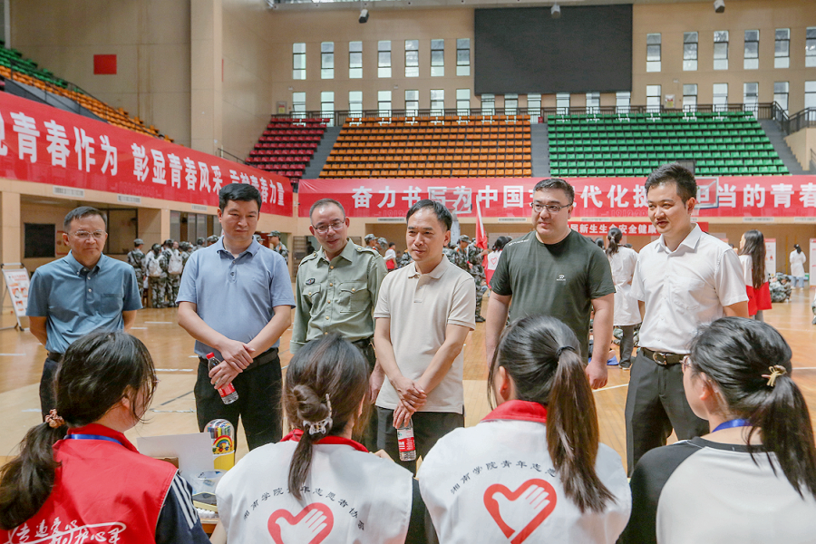活动分为实践演练和讲座两个环节。雷小勇、王雪峰现场观摩了实践演练,并与新生及工作人员亲切交流。实践演练现场设有禁毒知识、预防艾滋、心理健康、医疗急救、消防安全5个模块,各模块均有工作人员分站点进行讲解。新生们可通过参与各个模块的互动、游戏和问答进行闯关和“打卡”,进而认真学习消防安全、医疗急救相关知识,并进行实操训练,活动现场气氛热烈。