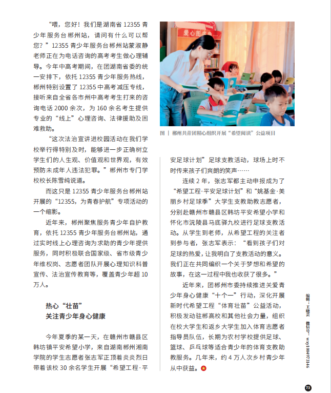 本网讯(通讯员 黄意维 李贤嘉 摄影 刘雨露)近日,由团郴州市委选送的《做好“育苗、护苗、壮苗”三篇文章,护航青少年成长》一文在《中国共青团》2024年第19期刊发,文中记录了贝博体育学院学生志愿者服务乡村基础教育、助力青少年身心健康的感人事迹。