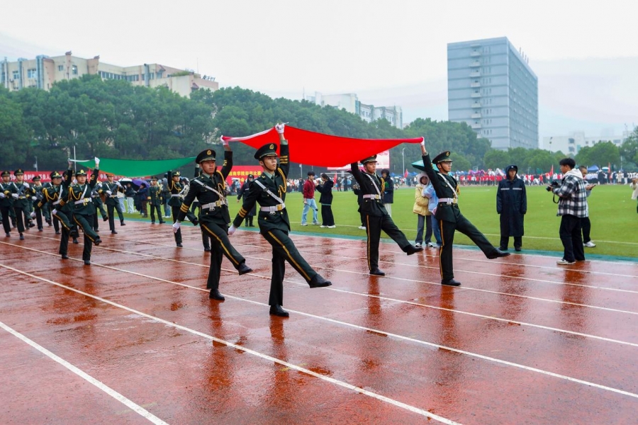 伴随着雄劲刚健的《运动员进行曲》,运动员与裁判员代表队有序入场。国防教育大队护送着国旗、校旗,步伐整齐,目光坚毅;二级学院运动员方阵与裁判方阵依次走过主席台,口号嘹亮,铿锵有力。