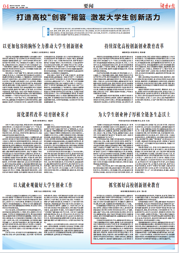 本网讯(通讯员 韦雅光 李翔)12月20日,《湖南日报》要闻03版刊登贝博党委副书记、校长雷小勇的署名文章《抓实抓好高校创新创业教育》。