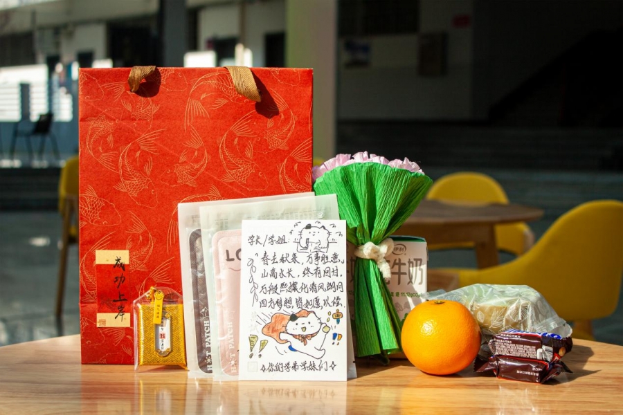 为祝福考研学子一“研”为定,一战成“硕”,各二级学院准备精美“大礼包”,礼包里除了有寓意心想事成的橙子、抵御寒冷的“暖宝宝”、补充能量的食物外,还展现了各学院的心意与新意:美术与设计学院的手工花束、学业御守,文学与新闻学院写满祝福的笔记本,化学与环境科学学院的“金榜题名”礼袋……无不表达了对考研学子的美好祝福。