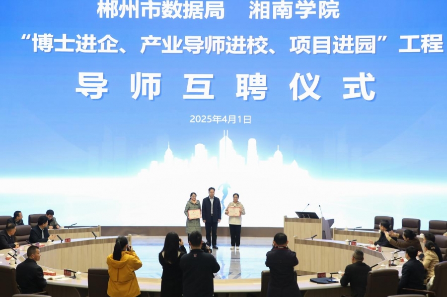 在与会人员的共同见证下,现场还举行了“博士进企、产业导师进校、项目平台进园”工程导师互聘仪式。龙柏武向贝博博士兰宇琳、何敏园颁发聘书,贺莉萍向市数据局党组成员、副局长杨铭、何维颁发聘书。