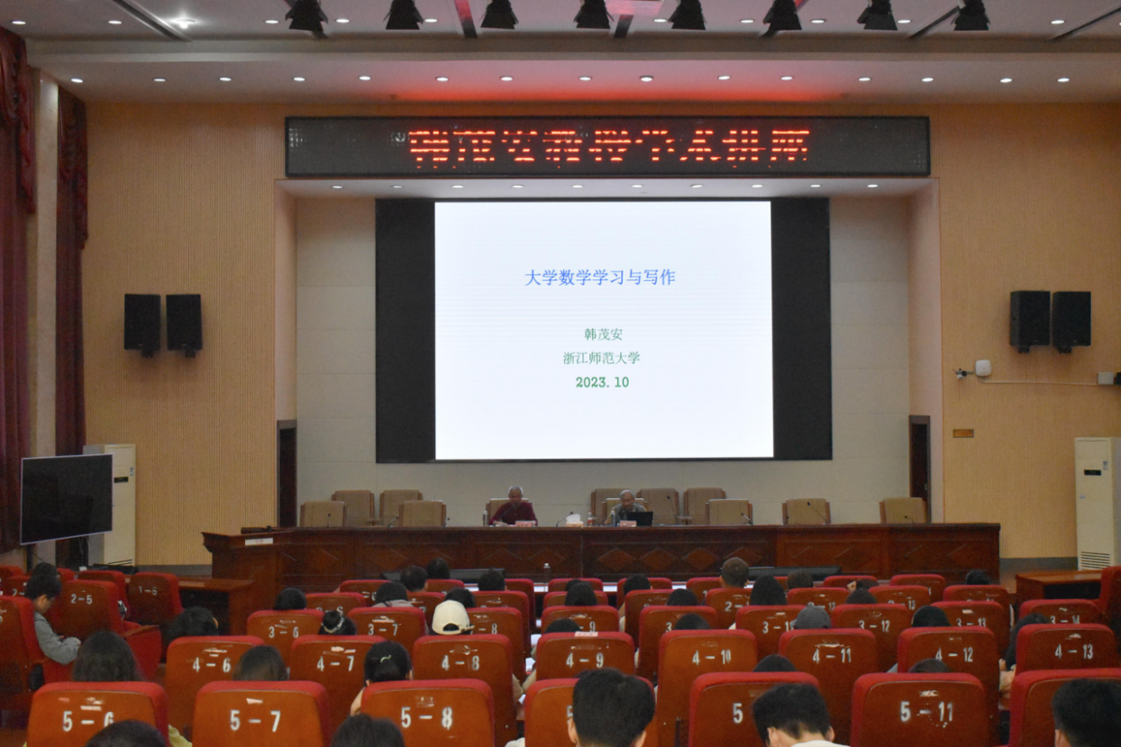 韩茂安以“大学数学学习与写作”为主题,结合自身经验,从“德”“智”“健”三大培养目标、思考与研读课本的重要性、数学写作基本原则等方面,结合自身经验,向大家讲解了如何学好数学、提高数学能力等问题。在问答环节中,数学与应用数学专业的学生们向韩茂安提出的问题都得到了一一解答,为学生们的思考方向开拓了新方向。