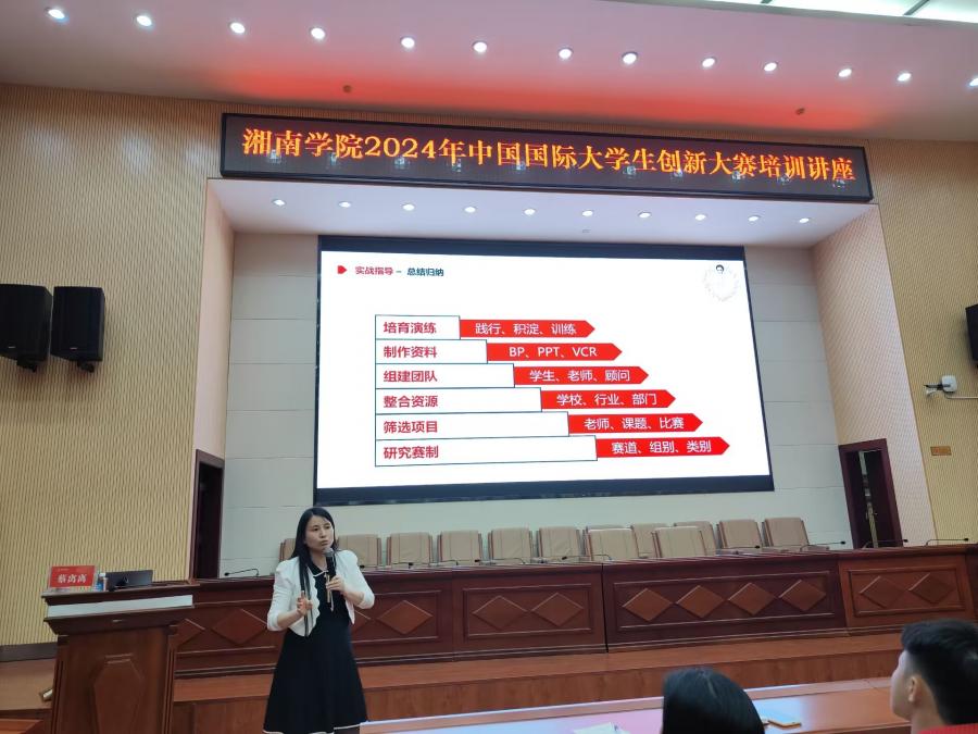 本网讯(通讯员 韦雅光)5月30日,贝博在图书馆西报告厅举办了2024年中国国际大学生创新大赛培训讲座。本次讲座特邀湖南开放大学导师蔡离离来贝博讲学,创新创业学院院长李翔主持讲座。