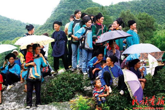 接着由执坛的水书先生诵读敬霞祝词,内容多为祈福禳灾,期冀风调雨顺,人寿年丰之类,祝颂之后便用酒祭之。仪式过程,以支系为单位,锣鼓声和助威声此起彼伏,穿戴时尚的年青人,三人一组抬着铜鼓,在人群中穿梭敲击,穿着自织青布的火枪队小伙子们则整齐列队,朝天鸣枪祝贺…… 隆重的民族传统节日,在今天被赋予了更多的娱乐成分,在场的人们心态各异,年青人似乎对民族传统文化的文本理解还有一定距离,特别是那些十一二岁的少年,他们在祭坛边的小溪上玩起打水仗游戏,时而追赶着水中鸭子,时而向过路行人泼水嬉戏。路边小商贩则摆上五颜六色的商品吆喝起来。