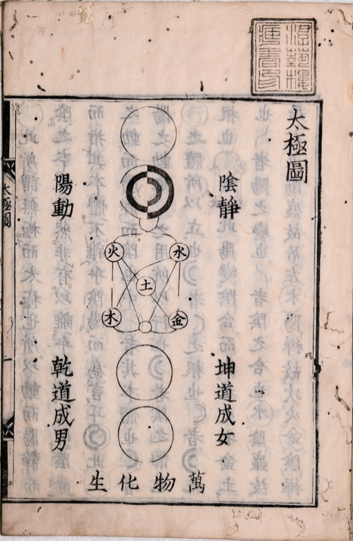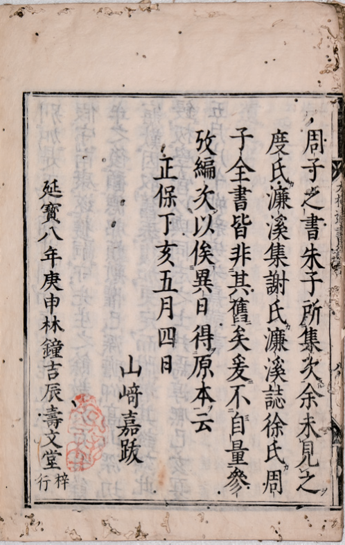 《周子太极通书》一册,不分卷,山崎嘉跋及训点。内容为:《太极图》、《太极图说》朱熹注、 《通书》朱熹注、朱熹《周子太极通书后序》、朱熹《书徽州婺源县周子通书板本后》。山崎嘉作跋于正保四年(1647),有延宝八年(1680)寿文堂刊本,四周双边,黑口双花鱼尾,每页九行,每行17字。牌记为“延宝八年庚申林钟吉辰寿文堂梓行”,跋文署款“正保丁亥五月四日山崎嘉跋”。钤印“游艺”。