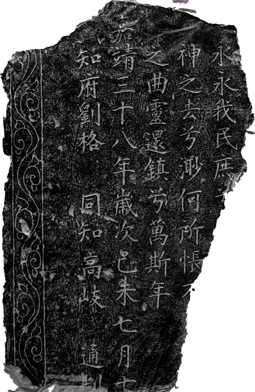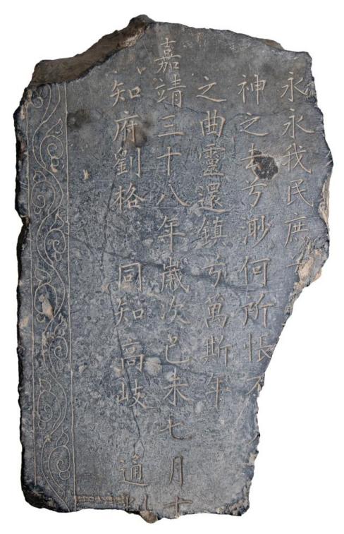 纵45cm,横30cm,厚24cm,楷书阴刻,石碑已残。署款“嘉靖三十八年岁次已未七月,知府刘格,同知高岐,通判……”。