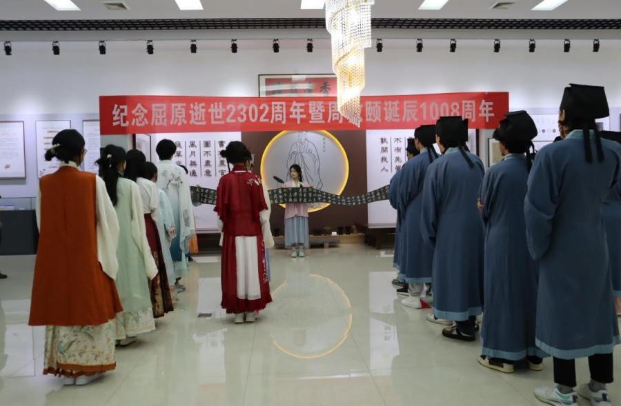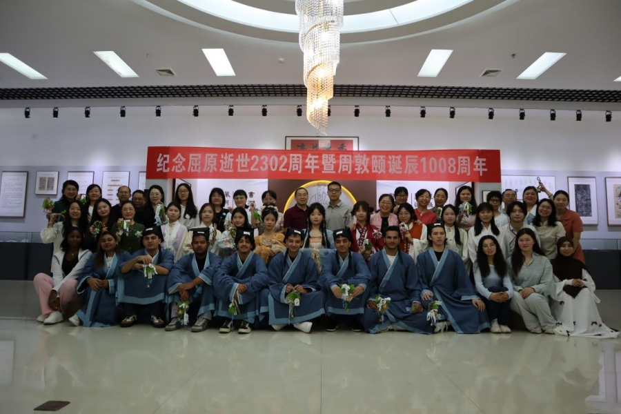 时值文学鼻祖屈原逝世2302周年、理学开山周敦颐诞辰1008周年双纪念节点,bb贝博艾弗森官网文学与新闻学院、外国语学院师生及留学生、bb贝博艾弗森官网社区等部门百余人齐聚周敦颐纪念馆,在清莲幽香与楚辞韵律中展开一场跨越千年的精神对话。