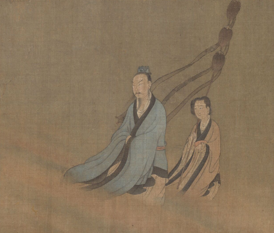 《九歌》是楚王祭奠天地云雨山川的乐歌,其中湘君、湘夫人即娥皇、女英,姐妹二人又称帝子、帝女、尧女,又别称湘妃,又称湘夫人、湘君、湘灵、湘女、江妃、二妃、舜妃,又别称湘神、湘水之神。她们本是帝尧的掌上明珠,又成了帝舜的贤内助;原本生于北方的妫水,又成了遥远的潇湘的水神;她们可能是封予潇湘,成为世袭的诸侯,但在民间书生的偶遇中又成了美丽的佚女。在历代画家的《九歌图》中,湘妃的身份继续变化。她们处于云雾水气之中,往来于凡人可望不可及的空间。